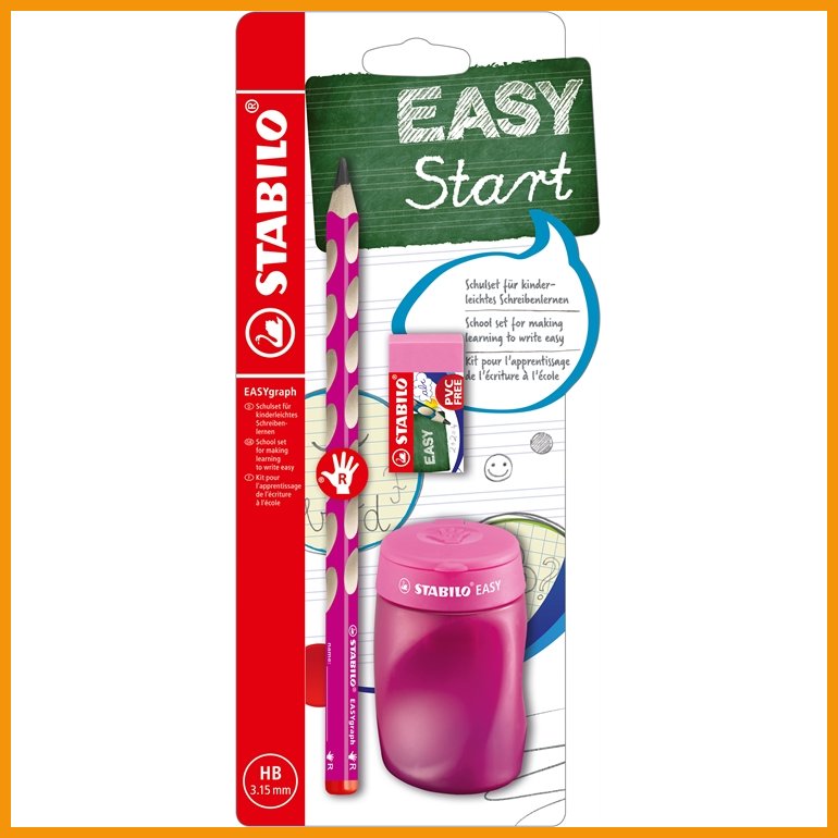 Stabilo Easygraph School Set on valmis setti koulun aloitukseen. Pakkauksessa on paksurunkoisen, lapsen käteen sopivan lyijykynän lisäksi yhteensopiva teroitin ja kumi, molemmat samaa särisävyä kuin kynän runko.Oikeakätisille suunnitellun ergonomisen lyijykynän kolmionmallisessa rungossa on sormien lipsumista ehkäisevät viisteet ja sen lyijyseos on lähes murtumaton. Kaikki STABILOn puiset kynät valmistetaan FSC- tai PEFC-sertifioidusta materiaalista.