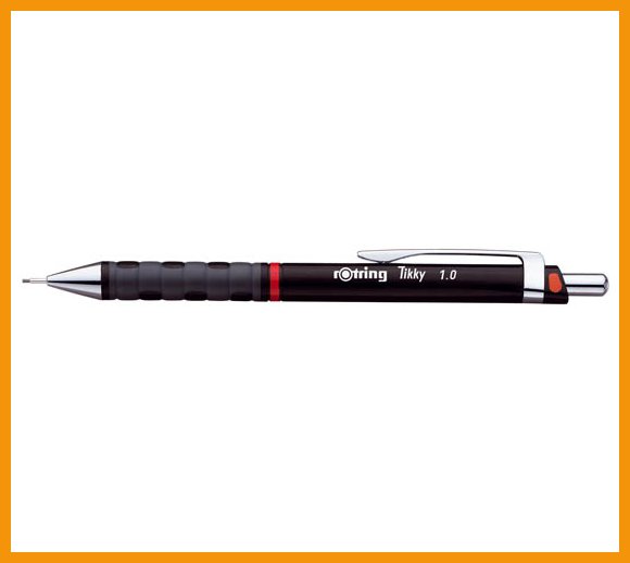 Ergonomisessa Rotring Tikky -lyijytäytekynässä on kolmionmuotoinen, kumipintainen runko ja lyijyn paksuuden kertova väritäplä. Mukana menossa myös metallinen taskupidike. Jäykkäputkinen kynä soveltuu erityisesti piirtämiseen.Lyijyn paksuus: 1,0 mm. Varalyijyksi soveltuu 0,9 mm irtolyijy.