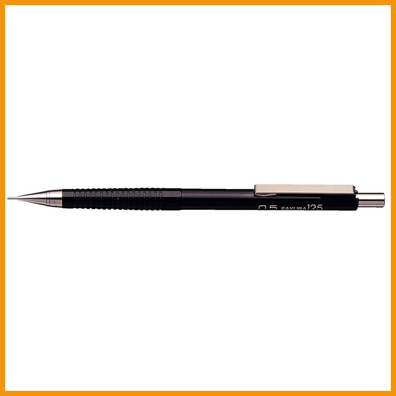 Sakura XS-125 -lyijytäytekynässä on jäykkä, jousitettu kärki ja metallinen taskupidike.Lyijyn paksuus: 0,5 mm.