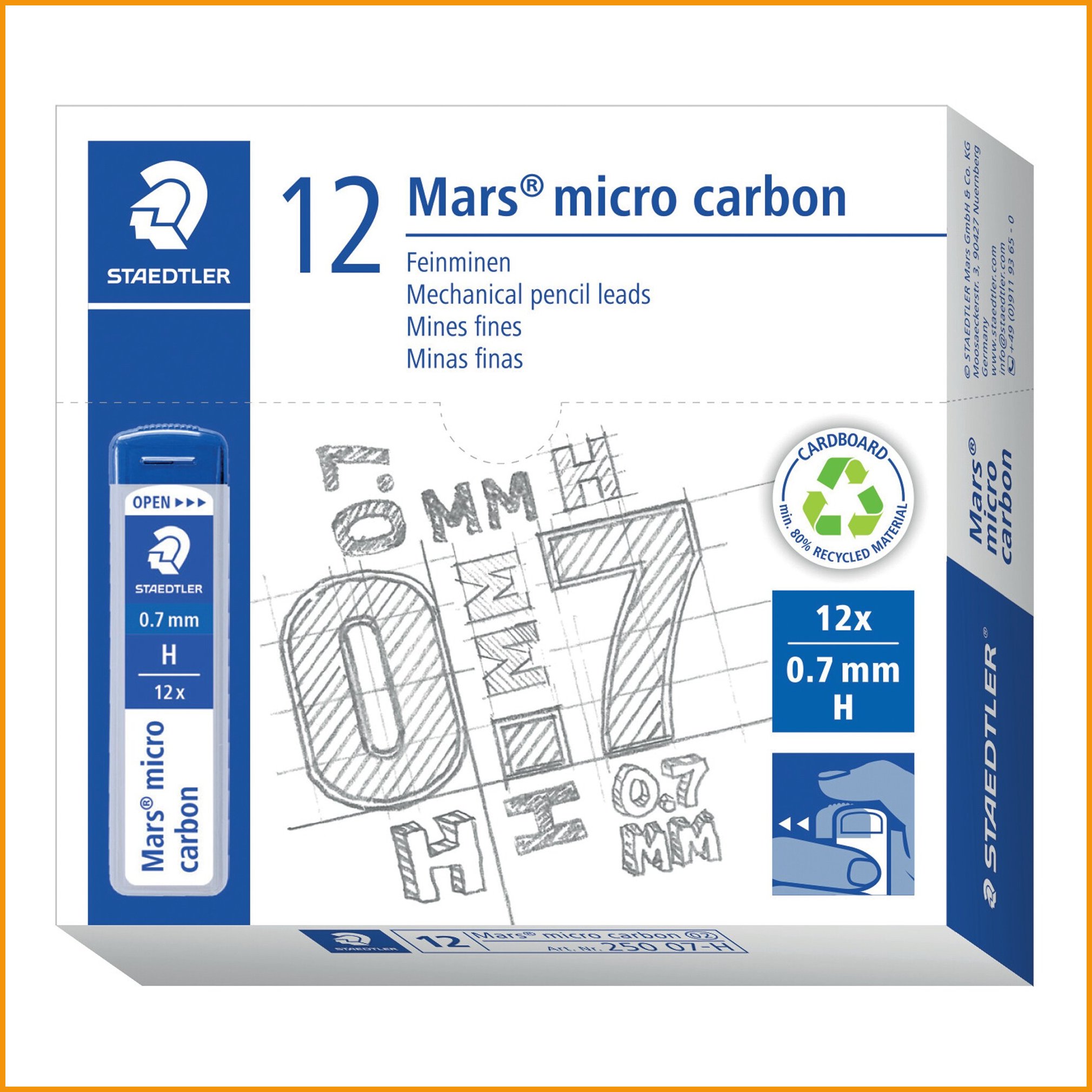 Lyijytäytekynän lyijy kovuus H irtolyijy 0,7 mm Staedtler mars micro 0,7h 12kpl on mainio toimistotuote, jonka verkkokaupan tilauksen toimitus kestää 1-2 päivää. Tiedäthän, että toimitus on ilmainen yli 140 € hintaisille verkkokauppa ostoksille! Meiltä voit tilata laskulla ja ilman rekisteröitymistä.