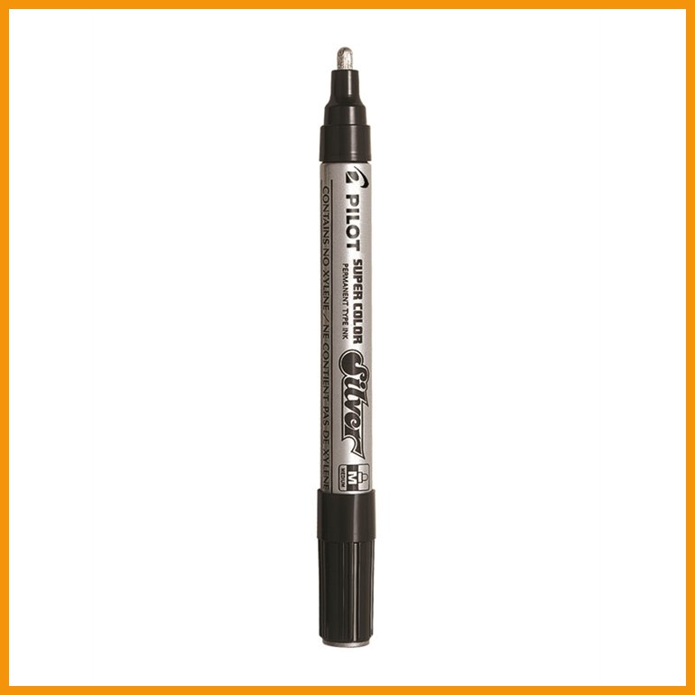 Pilot Super Color Marker hopean maalikynän xyleenitön ja pysyvä muste kuivuu nopeasti ja tarttuu useimmille pinnoille, kuten paperille, lasille, muoville, puulle, metalliin ja jopa kumille. Peittävä muste erottuu selvästi myös tummilta pinnoilta. Kynän alumiinirunko ja muotonsa säilyttävä akryylikärki kestävät kovaakin käyttöä.Musteen väri: hopea