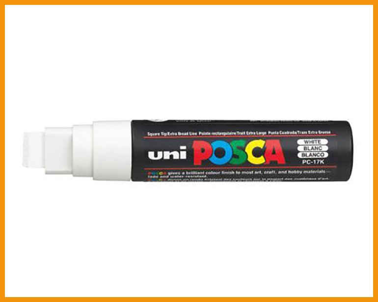 Niin sisä- kuin ulkokäyttöönkin soveltuvassa Uni Posca PC-17K valkoisessa maalikynässä on erityisen leveä kärki varmasti näkyvän jäljen tuottamiseen. Vesipohjainen, vesiliukoinen ja sekä valon- että vedenkestävä muste tarttuu ja kuivuu nopeasti lähes kaikille pinnoille. Kärjen voi irrottaa esim. pesua varten.Kuivuttuaan muste on pysyvää huokoisilla materiaaleilla, kuten paperilla, kartongilla ja betonilla. Sileiltä pinnoilta musteen voi pestä pois.