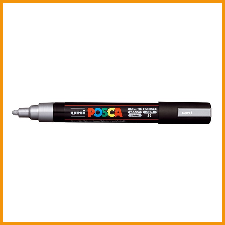 Uni Posca PC-5M hopean maalikynän peittävä pigmenttimuste on kuivuttuaan veden- ja valonkestävää. Hajuton, vesipohjainen ja pysyvä muste tarttuu lähes kaikenlaisille pinnoille, kuten kartongille, kivelle, tekstiileille, puulle, muoville, keramiikalle, metallille ja lasille. Polyesterikärki kestää hyvin käyttöä.Musteen väri: hopea