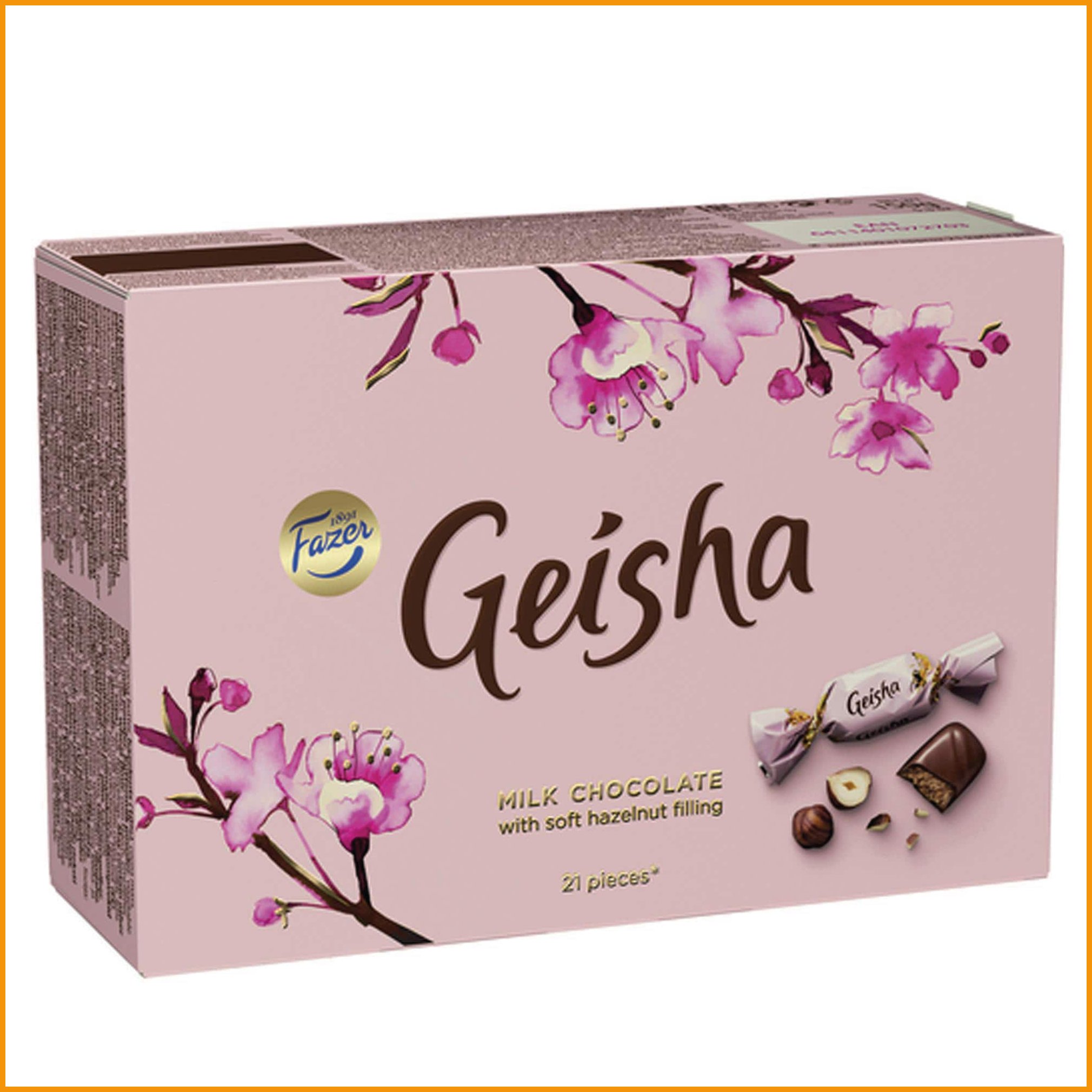 Geishan pehmeä maitosuklaa kätkee sisäänsä hasselpähkinänougat-täytteen. herkullisten geisha-konvehtien maitosuklaakuoren sisällä odottaa pehmeän rapea täyte. mikä parasta, kaikki fazerin herkulliset suklaat on valmistettu 100 % vastuullisesti tuotetusta kaakaosta. nauti konvehti tai pari ja keskity hyvään.Maitosuklaakonvehdit toimitetaan 12 kappaleen erissä.