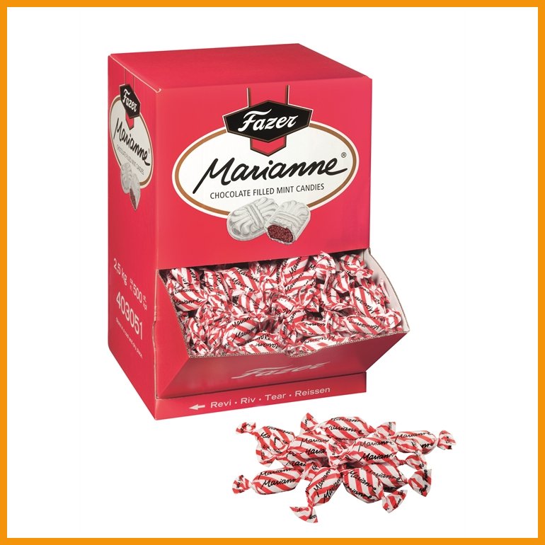 Fazer Marianne on kovalla piparminttukuorella kuorrutettu suklaakaramelli, jonka pakkauksen punavalkoraidat ovat kaikille tutut jo vuosikymmenten takaa. Klassikkomakeinen on gluteeniton, vegaaninen ja vähälaktoosinen. Kotimaisella tuotteella on Avainlippu-tunnus.Sisältö: 2,5 kg