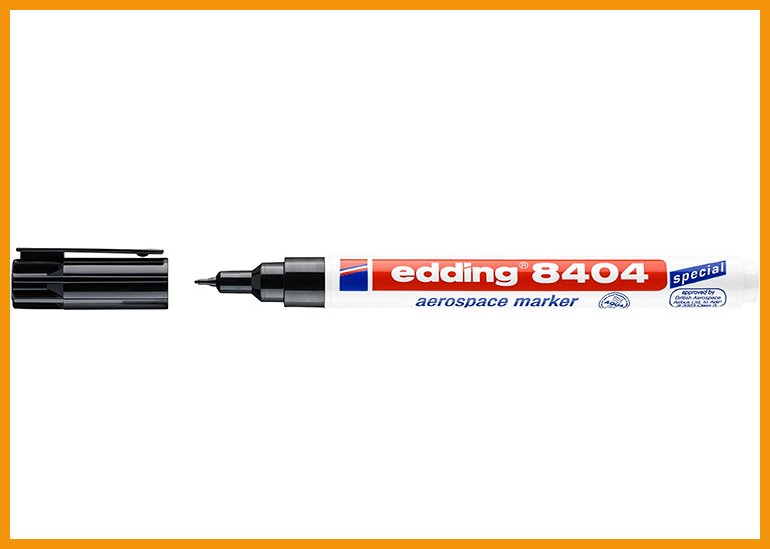 Edding 8404 Aerospace Marker on suunniteltu erityisesti ilmailualan tarpeisiin ja komponenttien merkintään. Kynässä on muovirunko ja taskuklipsillä varustettu suojakorkki.Pysyvä ja vesipohjainen pigmenttimuste tarttuu lähes kaikenlaisille pinnoille metallista lasiin ja kumista muoviin. Kiinnityttyään muste kestää niin vettä ja valoa kuin jopa liuottimia ja maalejakin (ABP 9-3323 standard, Class A).