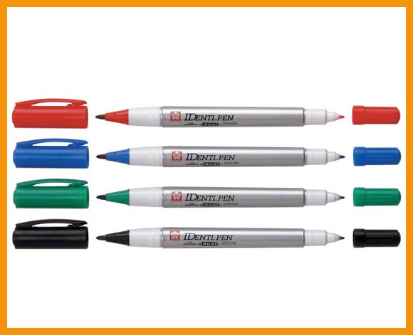Kaksipäinen Sakura Identi-Pen sopii monenlaiseen merkintään useimmille ei-huokoisille pinnoille, kuten nahka, metalli, puu, lasi, kangas ja paperi. Pysyvä, spriiliukoinen, lähes hajuton ja nopeasti kuivuva muste on xyleenitöntä ja sekä valon- että vedenkestävää. Kärjet kestävät kovaakin käyttöä.Musteen väri: musta, punainen, sininen ja vihreä