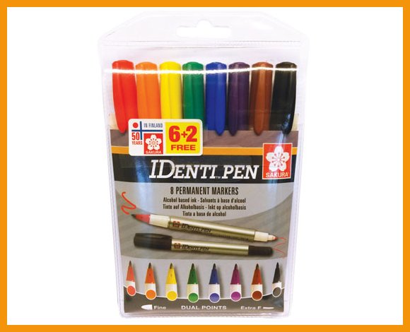 Kaksipäinen Sakura Identi-Pen sopii monenlaiseen merkintään useimmille ei-huokoisille pinnoille, kuten nahka, metalli, puu, lasi, kangas ja paperi. Pysyvä, spriiliukoinen, lähes hajuton ja nopeasti kuivuva muste on xyleenitöntä ja sekä valon- että vedenkestävää. Kärjet kestävät kovaakin käyttöä.Musteen väri: värilajitelma
