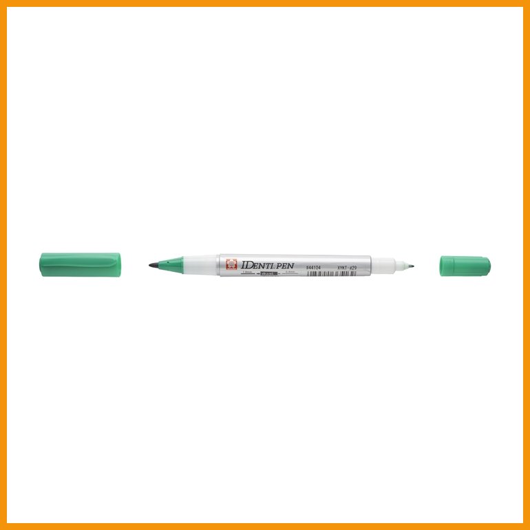 Kaksipäinen Sakura Identi-Pen sopii monenlaiseen merkintään useimmille ei-huokoisille pinnoille, kuten nahka, metalli, puu, lasi, kangas ja paperi. Pysyvä, spriiliukoinen, lähes hajuton ja nopeasti kuivuva muste on xyleenitöntä ja sekä valon- että vedenkestävää. Kärjet kestävät kovaakin käyttöä.Musteen väri: vihreä