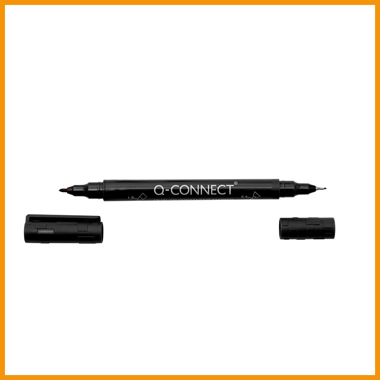 Q-CONNECTin kaksipäisessä merkkauskynässä on nimensä mukaisesti kaksi erikokoista ja kestävää kärkeä (0,4 mm ja 1 mm). Pysyvä, vedenkestävä, miedonhajuinen ja riittoisa muste kuivuu nopeasti, ei suttaa, ja jättää siistin ja tarkan jäljen. Muste on ksyleenitöntä. Kynää voi käyttää monelaisille pinnoille, kuten paperille, kartongille sekä muoville.Kynän runko on valmistettu vähintään 50-prosenttisesti GRS-sertifioidusta kierrätysuovista.