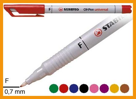 STABILO OHPen -merkkauskynä soveltuu lähes kaikenlaisten sileiden pintojen merkintään. Vesiliukoinen muste juoksee kevyesti eikä kynä kuivu 72 tuntiin, vaikka korkki unohtuisi auki. Jälki irtoaa kostealla pyyhittäessä. Ventiloidussa suojakorkissa on taskuklipsi.Erotat vesiliukoisen kynän pysyvämusteisesta vastineestaan harmaasta rungosta. Pysyvämusteisen version varsi on musta.