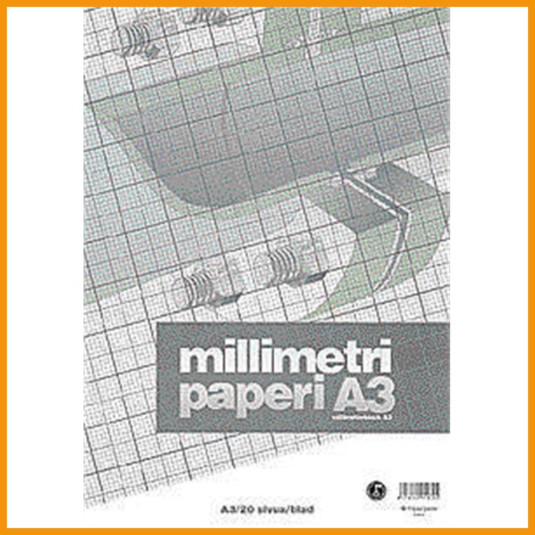 Millimetripaperi antaa apua monenlaiseen tarkkaan työskentelyyn. Sivuilla on oranssilla värillä painettu 1 x 1 mm ruudutus, jossa on apuviivat sekä 5 x 5 mm että 10 x 10 mm ruuduilla. Reunassa on lisäapuviivat 50 mm välein. Valkoinen paperi on puuvapaata ja kansi on kartonkia.Kotimaisella tuotteella on Avainlippu.