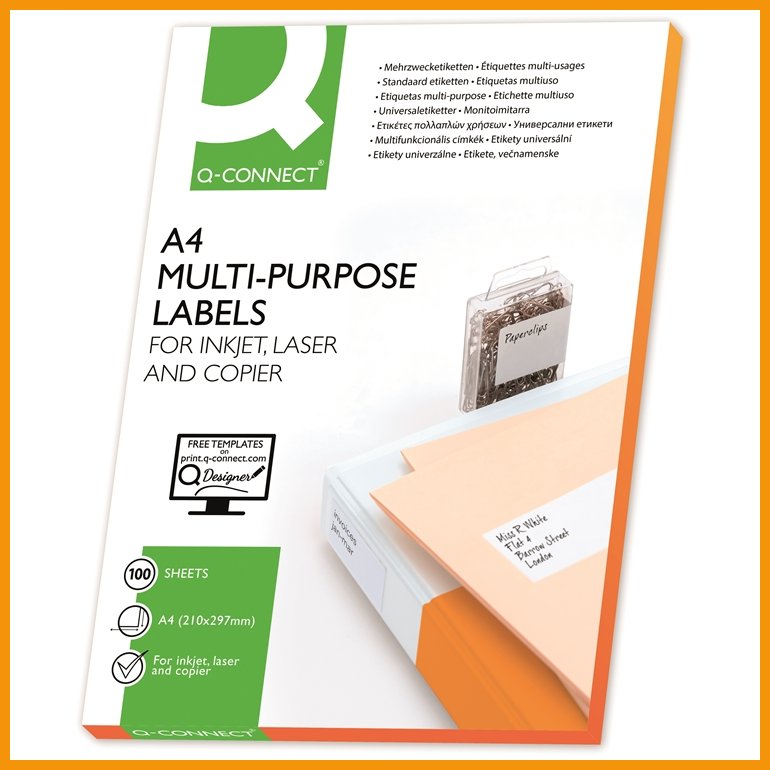 Q-CONNECTin monikäyttötarrat soveltuvat niin kopiointiin kuin sekä laser- että mustesuihkutulostukseenkin. Tarroissa on pyöristetyt kulmat. Voit ladata valmiin tulostuspohjan osoitteesta www.q-connect.com/q-designer.