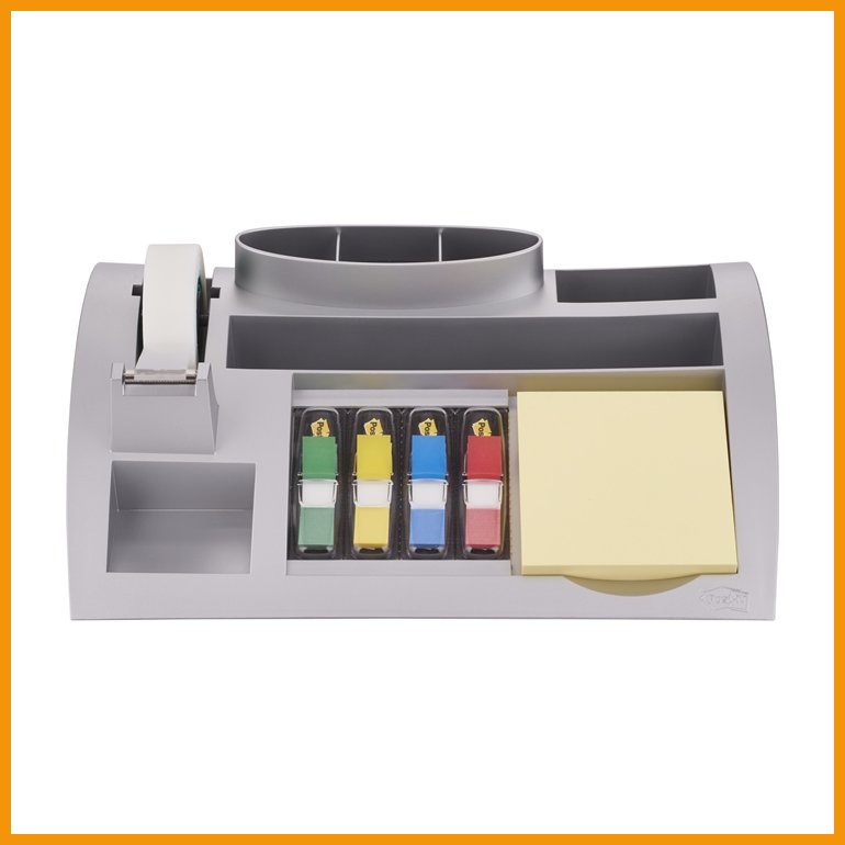 Hopeanharmaan, hyvin paikallaan pysyvän 3M C50 -pöytätelineen avulla toimistotarvikkeesi pysyvät hyvässä järjestyksessä. Telineessä on seitsemän erillistä lokeroa kynille, liittimille, käyntikorteille ja muille tarvikkeille.