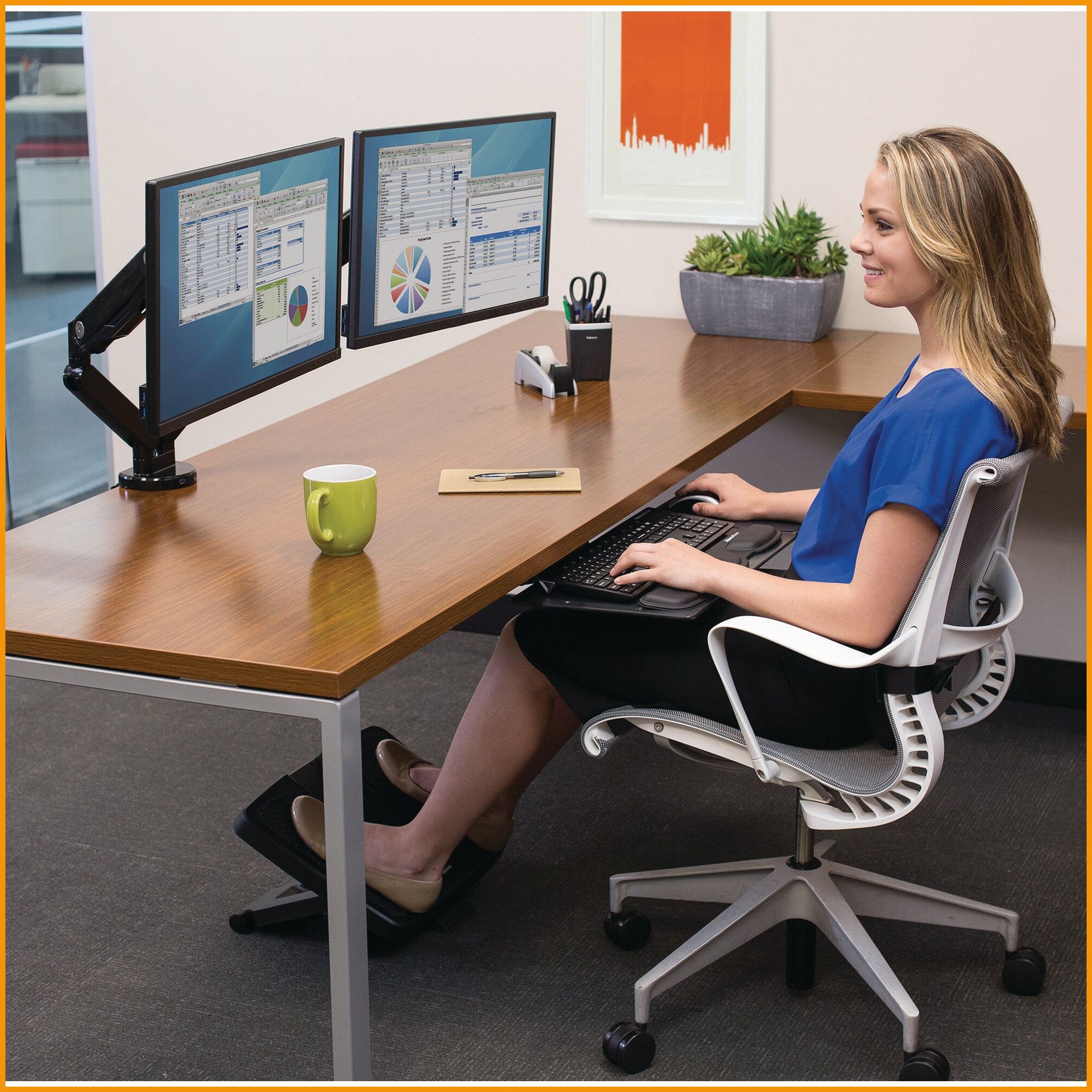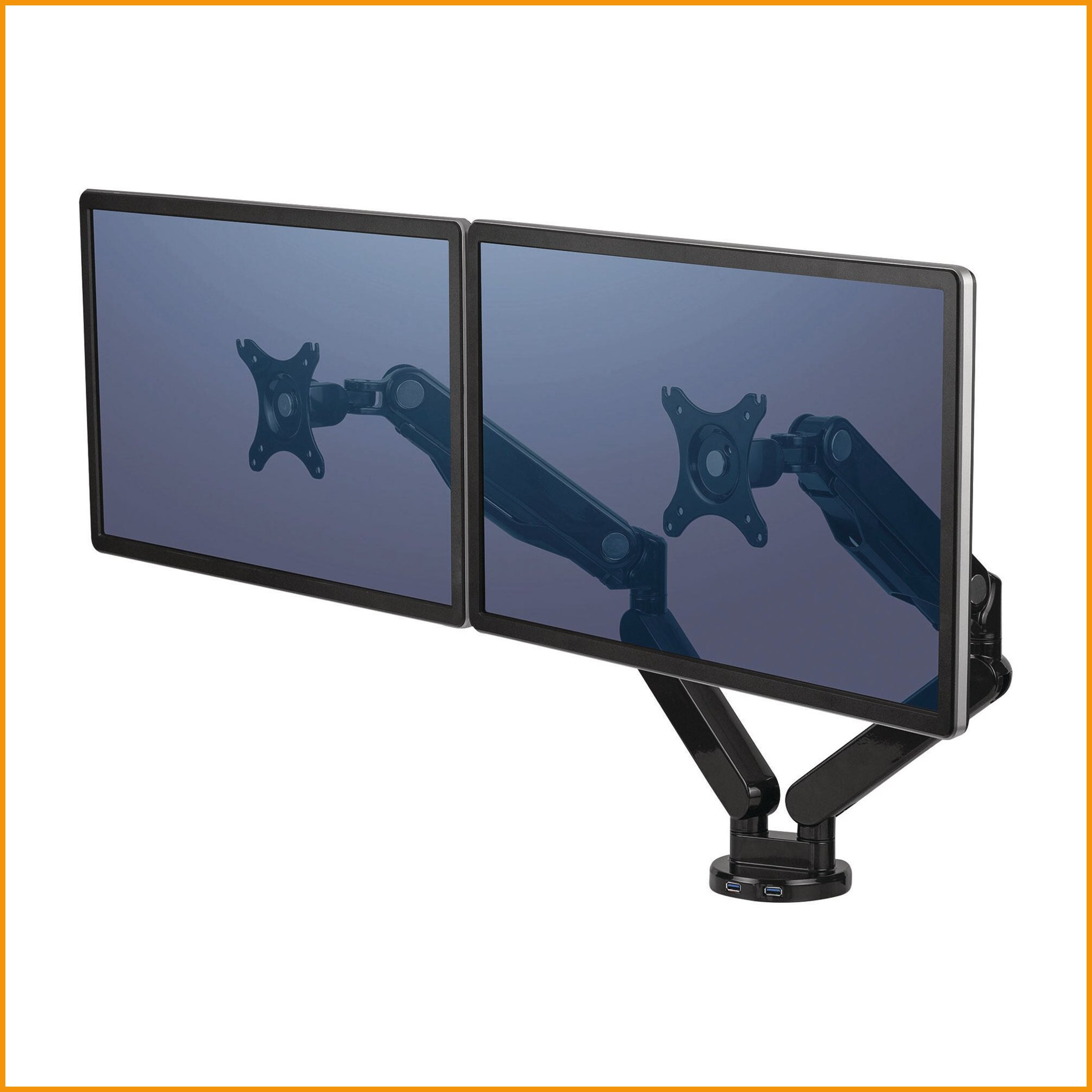 Vapauta työpöytätilaa parempaan käyttöön ja kiinnitä kaksi näyttöäsi täysin itsenäisesti säädettäviin monitorivarsiin. et tarvitse uusia näyttöjä, vaan voit kiinnittää nykyiset monitorisi fellowesin kaasujousilla varustettuihin monitorivarsiin. varsien avulla säädät vaivattomasti näyttöjesi korkeuden ja kulman juuri oikeaksi, joten hyvä työergonomia on näyttöjen osalta taattu. molemmat varret ovat itsenäisesti säädettävissä: voit säätää sekä kallistusta, korkeutta että syvyyttä. varret yhdistävä jalusta on helppo kiinnittää pöytään puristimella tai läpiviennillä. jalustan etupaneelissa on myös kaksi usb 3.0 -väylää. jokainen monitorivarsi kantaa korkeintaan 9 kg:n painoisen ja/tai 30" näytön. kallistuskulma: +85 / -15°. korkeussäätö enintään 40 cm. syvyyssäätö enintään 50 cm. vesa 75 / 100 -kiinnitys.Monitorivarsi Fellowes platinum kahdelle näytölle on mainio ergonomiatuote, jonka verkkokaupan tilauksen toimitus kestää 1-2 päivää. Huomaa, että ilmainen toimitus on kaikilla yli 140 € hintaisilla tilauksilla! Meiltä voit tilata laskulla ja ilman rekisteröitymistä.