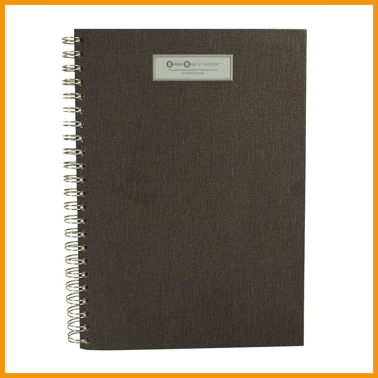 Bigson klassisessa muistikirjassa on blankot sivut, kaksoiskierresidonta ja kierrätyskartongista valmistettu kohokuvioinen paperilaminoitu kansi.Mitat: A4 (300 x 215 mm)