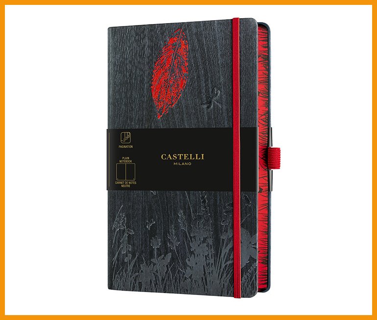 Castelli Milanon muistikirjat ovat sekä käytännöllisiä että tyylikkäitä. Blankot norsunluunväriset sivut on sivunumeroitu. Kovakantisessa kirjassa on sisällysluettelo, kuminauhasuljenta, kynälenkki, dokumenttitasku ja kirjanmerkkinauha.Kirjan sivut on valmistettu FSC-sertifioidusta puuaineksesta.
