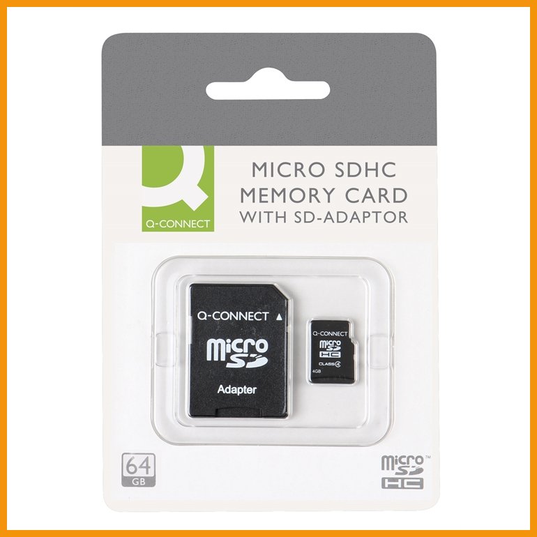 Q-Connectin Micro SDHC-muistikortin mukana tulee täysikokoinen SD-adapteri, jonka avulla se sopii sekä MicroSD- että SD-muistikorttipaikkoihin. Tällaisia tuotteita ovat esimerkiksi monet kamerat, iPadit, MP3-soittimet ja älypuhelimet.Kapasiteetti: 64 GB