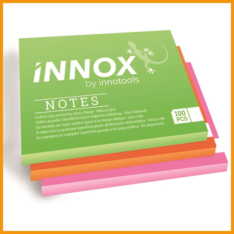 Innotoolsin Innox Notes on uuden sukupolven muistilappu, joka kiinnittyy tasaisille pinnoille perinteisen liiman sijaan staattisen sähkön avulla. Polypropeenikalvosta valmistetut muistilaput kiinnittyvät tiukasti lähes kaikkiin tasaisiin pintoihin, kuten metalliin, lasiin, korkkitauluihin, tiiliin, tekstiileihin, nahkaan ja kiveen. Koska lapuissa ei ole liimaa, voi niitä siirtää ja liikutella vapaasti ilman tahroja.Lappujen värikkäälle etupuolelle voi kirjoittaa kaikenlaisilla kynillä ja hätätilassa raapustaa jopa avaimella tai muulla kovalla kärjellä. Valkoinen taustapuoli on pyyhittävissä ja käytettävissä uudelleen, jos siihen kirjoitetetaan vesiliukoisella tussilla.