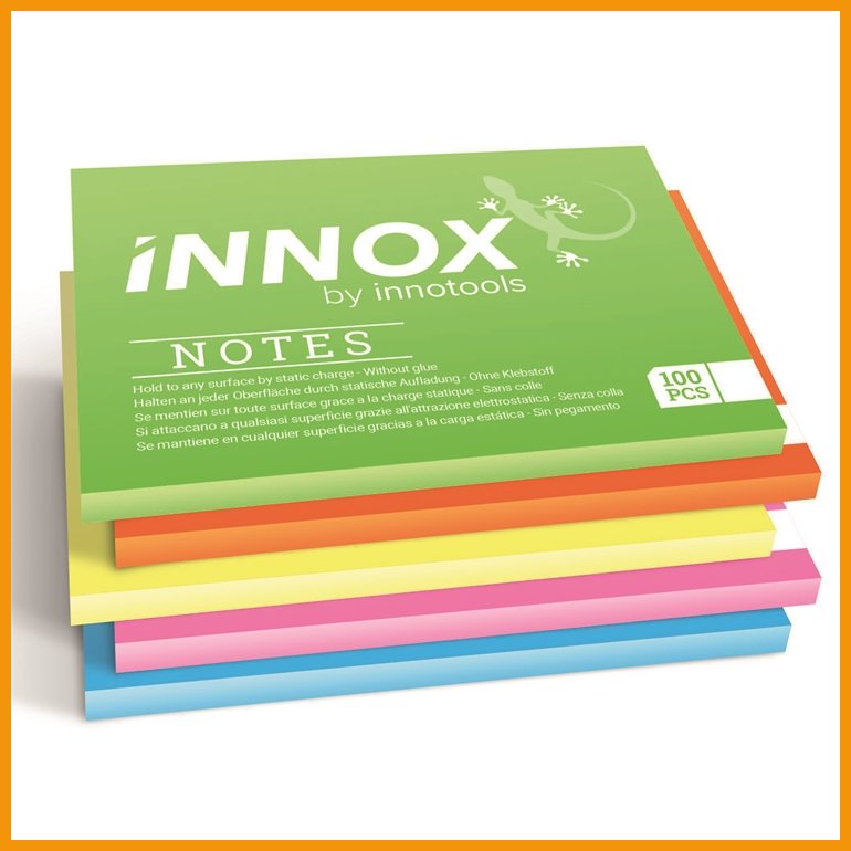 Innotoolsin Innox Notes on uuden sukupolven muistilappu, joka kiinnittyy tasaisille pinnoille perinteisen liiman sijaan staattisen sähkön avulla. Polypropeenikalvosta valmistetut muistilaput kiinnittyvät tiukasti lähes kaikkiin tasaisiin pintoihin, kuten metalliin, lasiin, korkkitauluihin, tiiliin, tekstiileihin, nahkaan ja kiveen. Koska lapuissa ei ole liimaa, voi niitä siirtää ja liikutella vapaasti ilman tahroja.Lappujen värikkäälle etupuolelle voi kirjoittaa kaikenlaisilla kynillä ja hätätilassa raapustaa jopa avaimella tai muulla kovalla kärjellä. Valkoinen taustapuoli on pyyhittävissä ja käytettävissä uudelleen, jos siihen kirjoitetetaan vesiliukoisella tussilla.