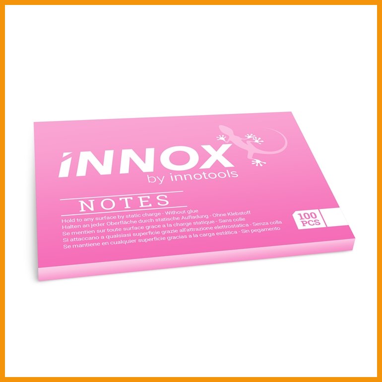 Innotoolsin Innox Notes on uuden sukupolven muistilappu, joka kiinnittyy tasaisille pinnoille perinteisen liiman sijaan staattisen sähkön avulla. Polypropeenikalvosta valmistetut muistilaput kiinnittyvät tiukasti lähes kaikkiin tasaisiin pintoihin, kuten metalliin, lasiin, korkkitauluihin, tiiliin, tekstiileihin, nahkaan ja kiveen. Koska lapuissa ei ole liimaa, voi niitä siirtää ja liikutella vapaasti ilman tahroja.Lappujen värikkäälle etupuolelle voi kirjoittaa kaikenlaisilla kynillä ja hätätilassa raapustaa jopa avaimella tai muulla kovalla kärjellä. Valkoinen taustapuoli on pyyhittävissä ja käytettävissä uudelleen, jos siihen kirjoitetetaan vesiliukoisella tussilla.