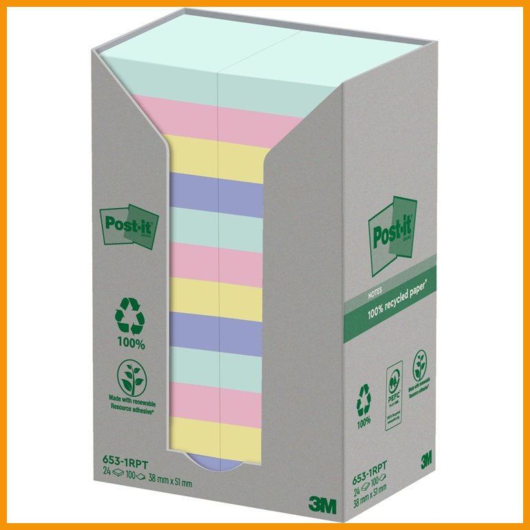Post-it Recycled Notes -muistilaput valmistetaan 100-prosenttisesti PEFC Recycled -sertifioidusta kierrätyspaperista. Myös liima on valmistettu 60-prosenttisesti uusiutuvista raaka-aineista. Pakkaus toimii säilytysrasiana.Mitat: 38 x 51 mm