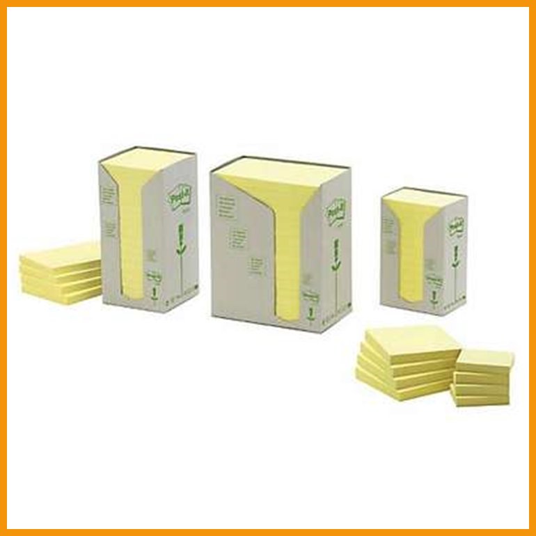 Post-it Recycled Notes -muistilaput valmistetaan 100-prosenttisesti PEFC Recycled -sertifioidusta kierrätyspaperista. Myös liima on valmistettu 60-prosenttisesti uusiutuvista raaka-aineista. Pakkaus toimii säilytysrasiana.Mitat: 76 x 127 mm