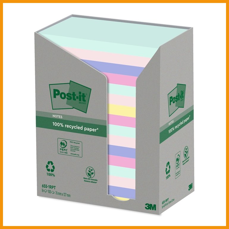Post-it Recycled Notes -muistilaput valmistetaan 100-prosenttisesti PEFC Recycled -sertifioidusta kierrätyspaperista. Myös liima on valmistettu 60-prosenttisesti uusiutuvista raaka-aineista. Pakkaus toimii säilytysrasiana.Mitat: 76 x 127 mm