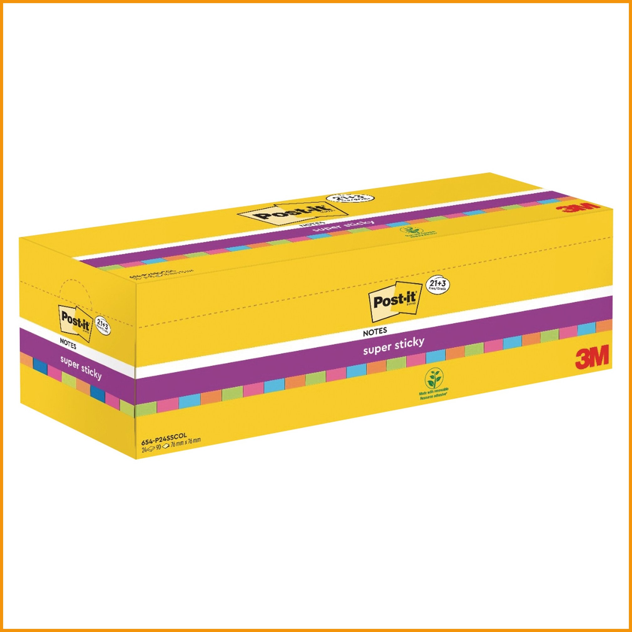 Laadukkaat ja monikäyttöiset post-it super sticky -muistilaput pysyvät tiukemmin ja pidempään kuin tavalliset. Niiden kiinnitys on tuplasti vahvempi kuin alkuperäisten post-it-muistilappujen. Vahvat muistilaput pysyvät paikallaan myös pystysuorilla ja tarttumista vastustavilla pinnoilla. Ne sopivat niin muistiinpanojen tekemiseen kuin viestien ja muistutusten jättämiseen. Post-it®-muistilaput valmistetaan pefc-sertifioidusta paperikuidusta, joka on peräisin kestävästi hoidetuista metsistä ja varmennetuista lähteistä. Ekologinen liima on valmistettu 60-prosenttisesti vuosittain uusiutuvasta kasviraaka-aineesta. 76 x 76 mm itsekiinnittyvät muistilaput myydään 90 lapun niteinä, joita on pakkauksessa 24 kpl.Muistilaput toimitetaan 24 kappaleen erissä.