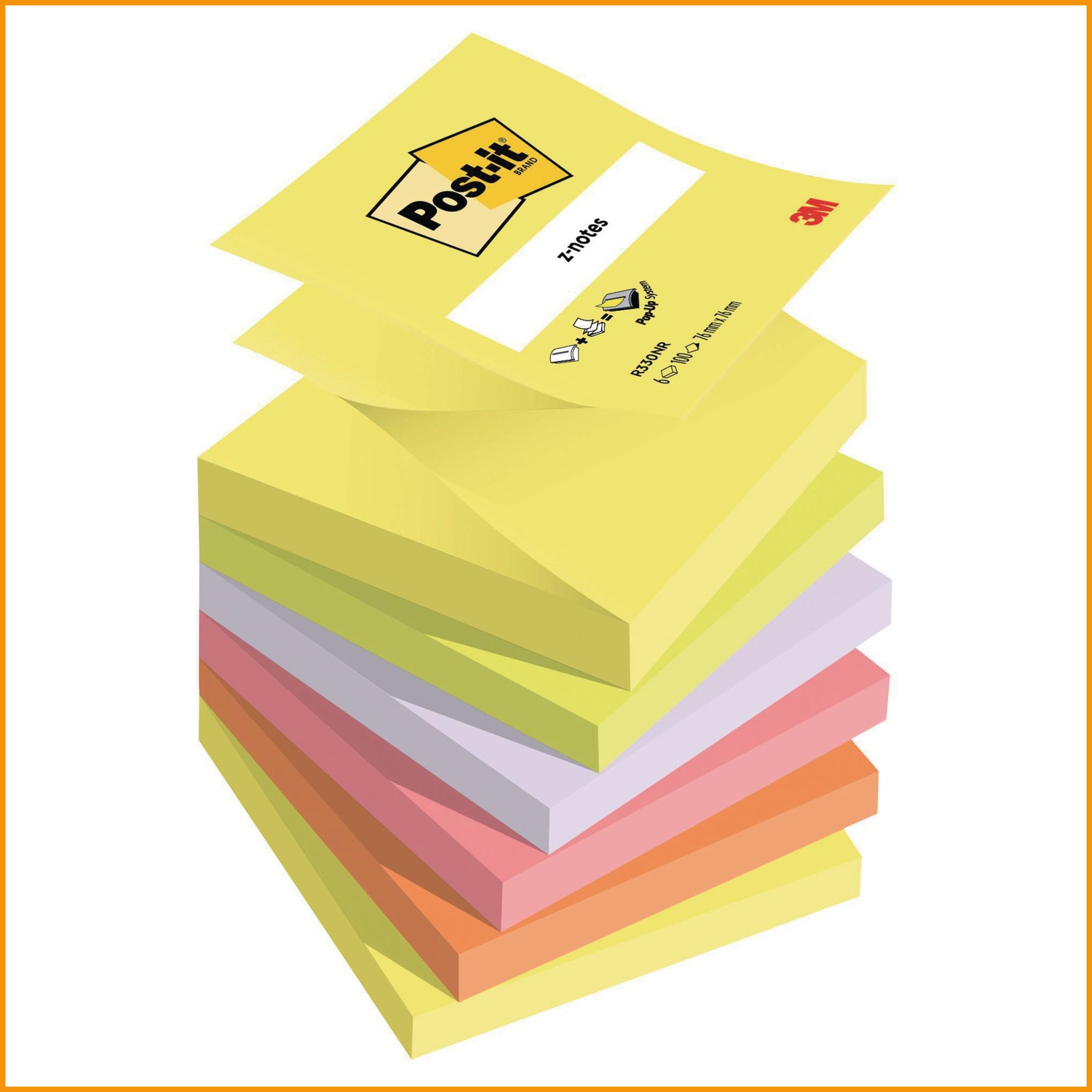 Post-it z-notes -muistilaput ovat käytännöllinen väline muistamiseen, muistuttamiseen ja viestien jättämiseen. Saat muistilapun niteestä vain yhdellä kädellä. Post-it®-muistilaput valmistetaan pefc-sertifioidusta paperikuidusta, joka on peräisin kestävästi hoidetuista metsistä ja varmennetuista lähteistä. Muistilapun mitat ovat: 76 x 76 mm. Värit; auringonkeltainen, liila, pinkki, oranssi, keltainen. Myyntierä: 1 pkt = 6 nidettä, joissa 100 lappua.Muistilaput toimitetaan 6 kappaleen erissä.