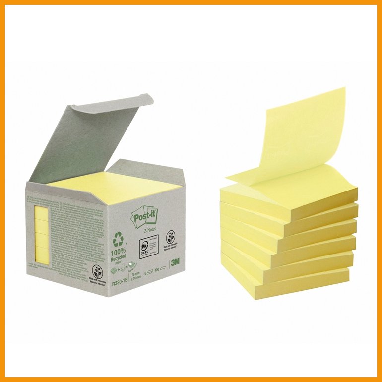 Post-it Z -muistilaput valmistetaan 100-prosenttisesti PEFC Recycled -sertifioidusta kierrätyspaperista. Myös liima on valmistettu 60-prosenttisesti uusiutuvista raaka-aineista. Pakkaus toimii säilytysrasiana. Lehtiö soveltuu Z-malliseen muistilappuannostelijaan, sillä laput ovat kiinni toisissaan haitarimaisesti.Mitat: 76 x 76 mm