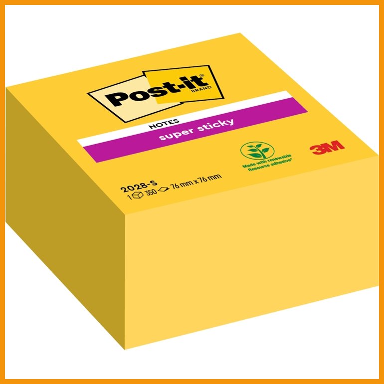 Post-it Super Sticky -muistilaput ovat kaksi kertaa tarttuvampia kuin alkuperäiset Post-it -muistilaput. Ne ovat omiaan etenkin pystysuuntaisilla ja hankalasti kiinnittyvillä pinnoilla, kuten tietokoneen näytöillä, ovilla tai seinillä. Kuutiossa riittää muistilappuja isompaankin tarpeeseen.Post-it -muistilaput valmistetaan PEFC-sertifioidusta materiaalista. Myös liima on valmistettu 60-prosenttisesti uusiutuvista raaka-aineista.