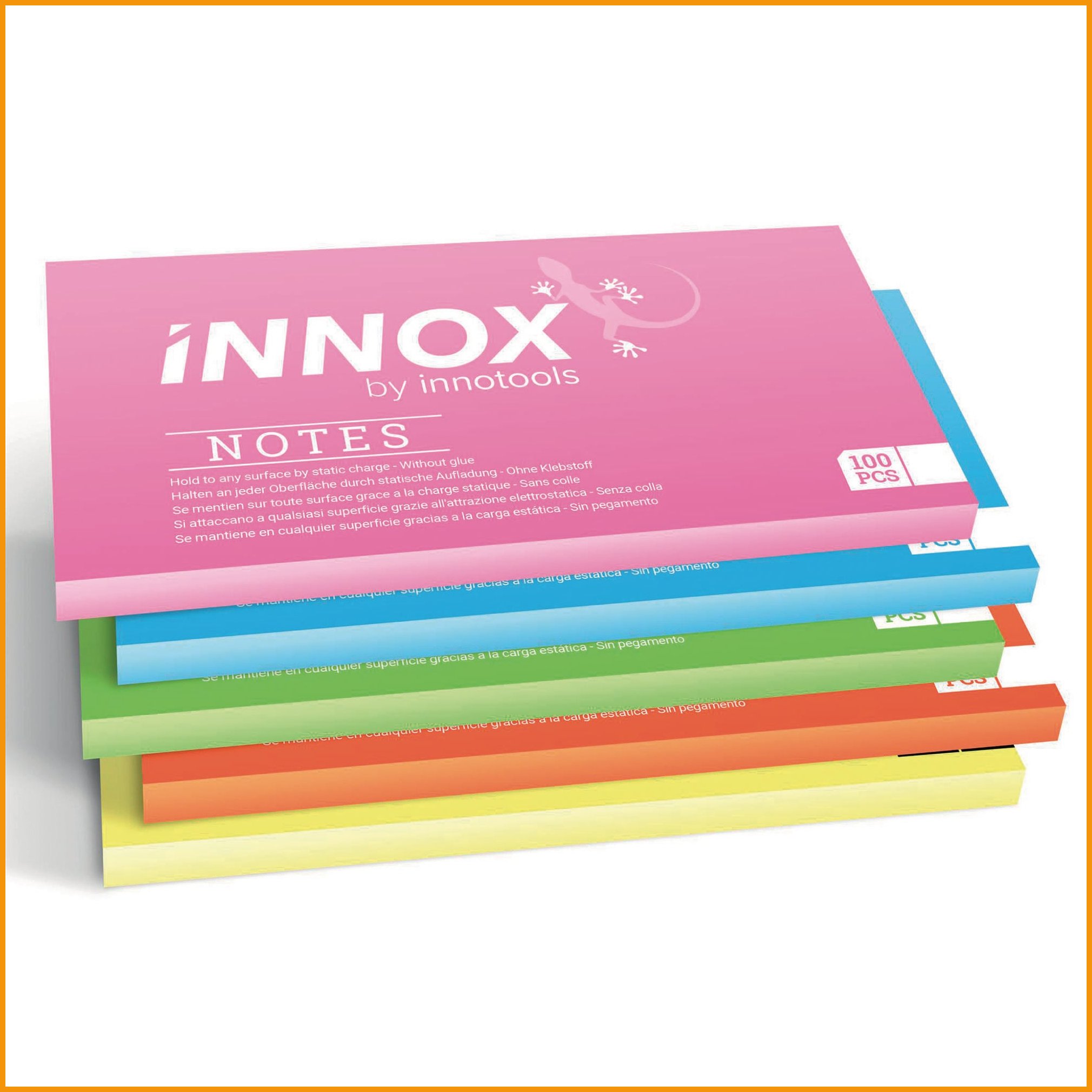 Innox notes -muistilapuilla saat teesisi seinään ilman nauloja. Innovatiiviset, sähköstaattiset muistilaput pysyvät kiinni millä tahansa tasaisella pinnalla, ja joita voidaan siirtää tahroja jättämättä. Muistilappujen virkeät värit herättävät myös huomion eivätkä jää huomaamatta. Värilajitelmassa on viisi eri väriä. Myyntierä: 1 kpl = 500 liuskaaMuistilaput toimitetaan 5 kappaleen erissä.