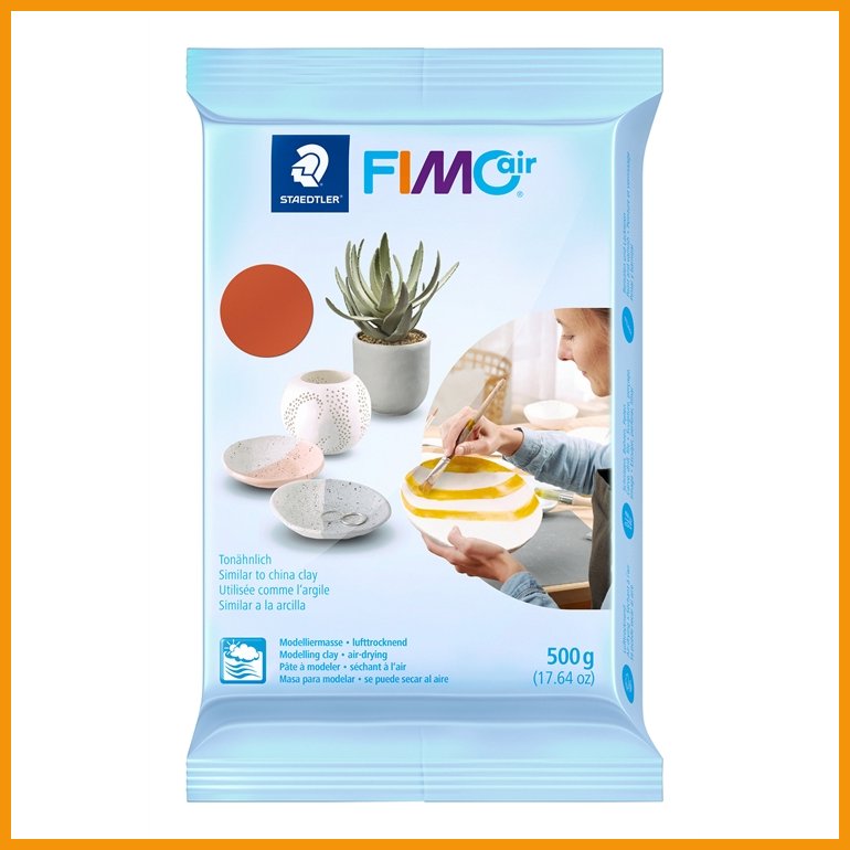 Staedtler FIMO air on savimainen muovailumassa, joka kuivuu ja kovettuu pelkän ilman vaikutuksesta. Foliolla vuorattu pakkaus estää muovailumassan ennenaikaisen kuivumisen. Massan avulla luot keramiikkaa, kuten astiat ja koriste-esineet helposti, ilman uunia tai muita lisätarvikkeita.FIMO air soveltuu monipuoliseen taide-, virkistys-, harrastus- ja koulutuskäyttöön niin kouluissa, päiväkodeissa kuin kotioloissakin. Valmiit taideteokset voidaan jatkokäsitellä mm. poraamalla, maalaamalla, lakkaamalla tai hiomalla.