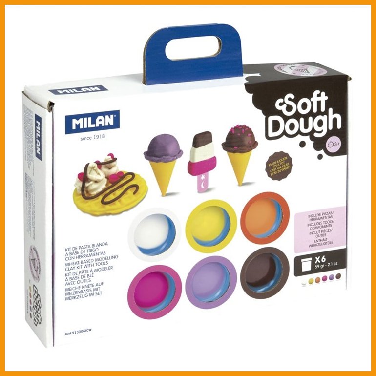 Milan Ice Cream & Waffles -muovailuvahasetissä on kuusi purkkia muovailuvahaa ja 10 erilaista työkalua taideteosten muotoiluun näppärästi mukana kulkevassa salkkupakkauksessa. Pehmeää ja vehnäpohjaista (huom. sisältää gluteenia) Soft Dough -muovailuvahaa on helppo muotoilla eikä se tartu käsiin.Pakkauskoko: 6 x 59 g