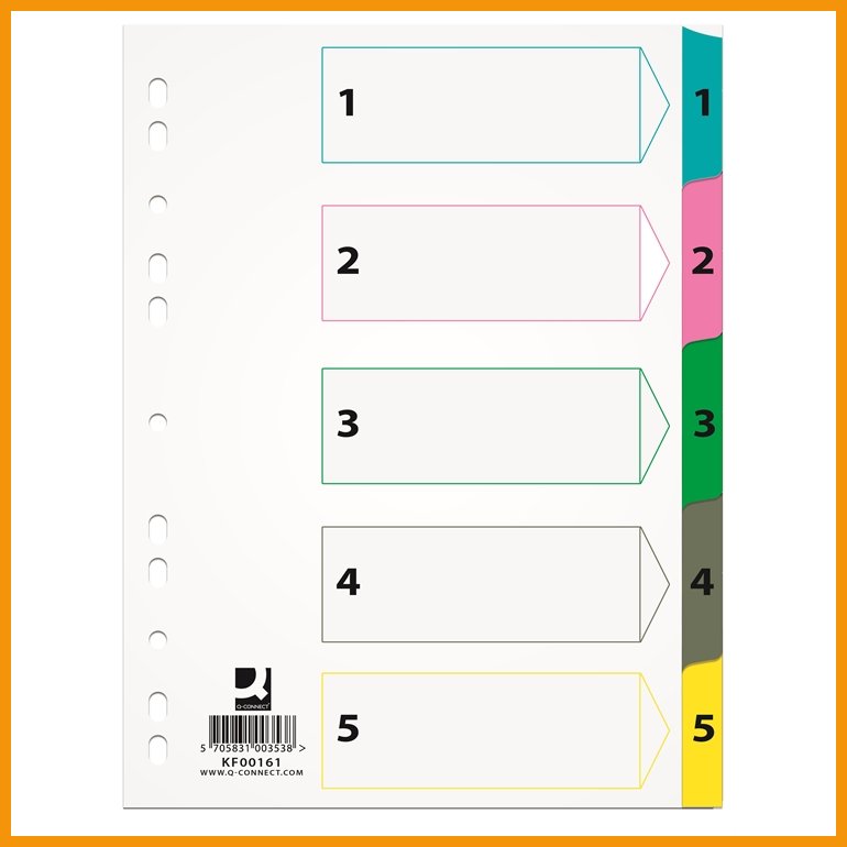 Q-CONNECTin muovikielihakemistossa on muovilla vahvistetut värilliset kielekkeet ja niinikään muovilla vahvistettu rei'ityksen puoleinen reuna. Muovivahvikkeiden alla on valkoista, tukevaa (170 gsm) kartonkia. Hakemistossa on numeroin 1-5 painettu etusivu ja kielekkeet.