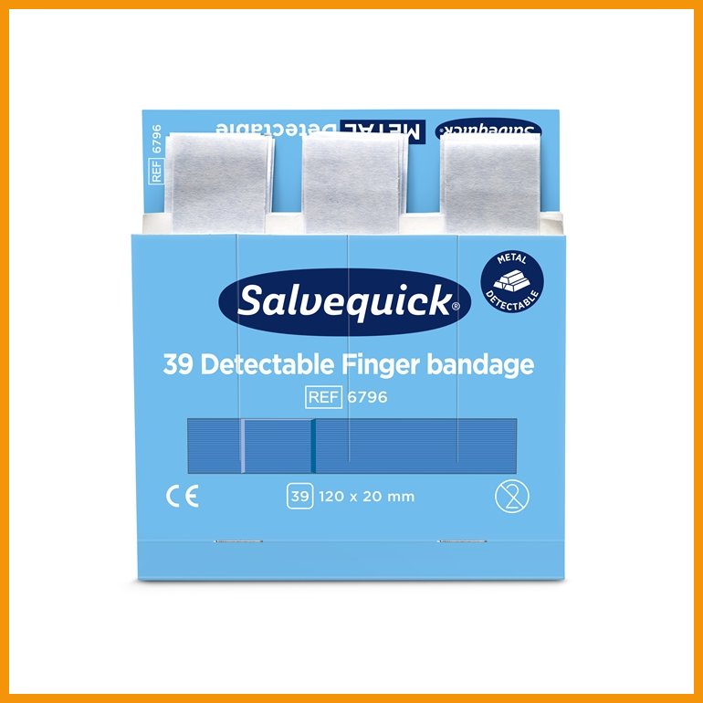Salvequickin erityispitkä sininen muovilaastari on suunniteltu erityisesti elintarvikealan tarpeisiin ja hankalien paikkojen, kuten peukalontyven, suojaamiseen. Sininen väri erottuu hyvin, ja laastarit on havaittavissa useimmissa elintarviketeollisuudessa käytettävissä metallinpaljastimissa. Laastari on allergiatestattu, helppo asettaa paikalleen ja miellyttävä käytössä.Kasettimallinen täydennyspakkaus sopii mm. Salvequick Laastariautomaattiin, jonka löydät verkkokaupastamme tuotenumerolla 270004.