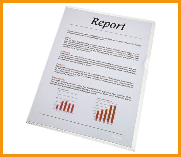 Esselten ylhäältä ja oikealta sivulta auki oleva muovitasku on läpinäkyvä ja kirkaspintainen. Taskun sivussa on käyttöä helpottava lovi.Koko: A4