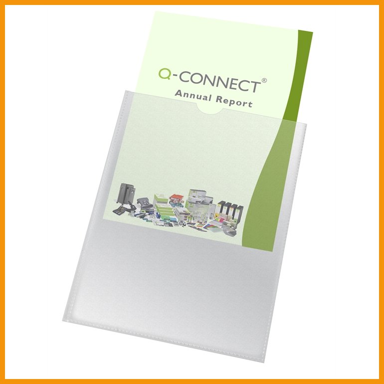 Q-CONNECTin ylhäältä auki oleva muovitasku on heijastamaton, appelsiinipintainen ja arkistokelpoinen. Taskun yläreunassa on käyttöä helpottava lovi.Koko: A4