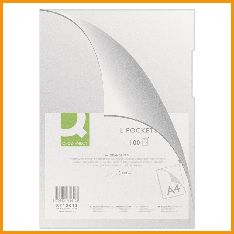 Q-CONNECTin ylhäältä ja oikealta sivulta auki oleva appelsiinipintainen muovitasku on läpinäkyvä, heijastamaton ja arkistokelpoinen.Koko: A4