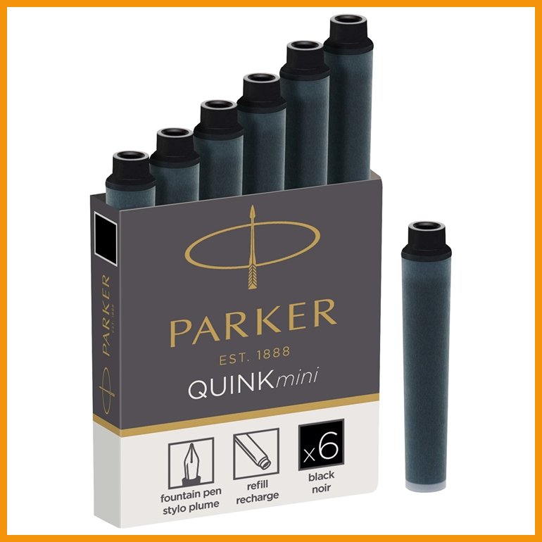 Pienikokoinen mustepatruuna Parker-mustekynääsi. Runsaspigmenttinen Quink-muste virtaa sujuvasti, kuivuu nopeasti ja jättää vahvan jäljen. Pysyvä muste on arkistokelpoista.Musteen väri: musta