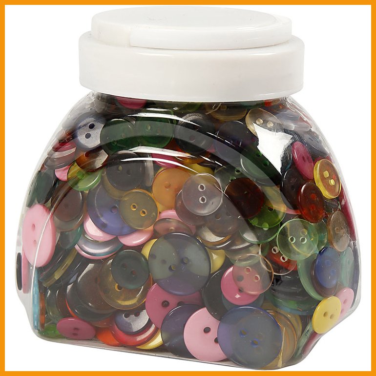 Litteitä, yksivärisiä pyöreitä muovinappeja, joissa 2 aukkoa. Halkaisijat: 12mm, 18mm ja 20mm. Värilajitelma. Pakkauksessa 800 nappia.