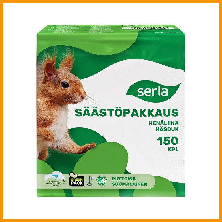 Serlan pehmeä ja hygieeninen, kaksikerroksinen nenäliina.Suomessa ensikuidusta valmistetulla ja hellävaraisella tuotteella on sekä kotimainen Avainlippu-tunnus, pohjoismainen Joutsenmerkki että Allergia-, Iho- ja Astmaliiton tunnus.