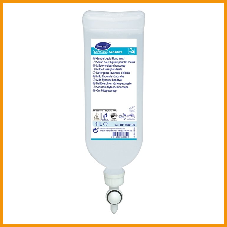 Diversey Soft Care Sensitive on erityisesti herkälle iholle sopiva hajusteeton ja väriaineeton käsienpesuneste. Hellävaraisen koostumuksensa ansiosta se soveltuu usein toistuvaan käsienpesuun mm. terveydenhuollossa, ammattikeittiöissä, elintarviketeollisuudessa, kouluissa ja oppilaitoksissa. Dermatologisesti testattu tuote sopii myös vartalon ja hiusten pesuun.Tuotteella on sekä EU Ecolabel -ympäristösertifikaatti että pohjoismainen Joutsenmerkki.