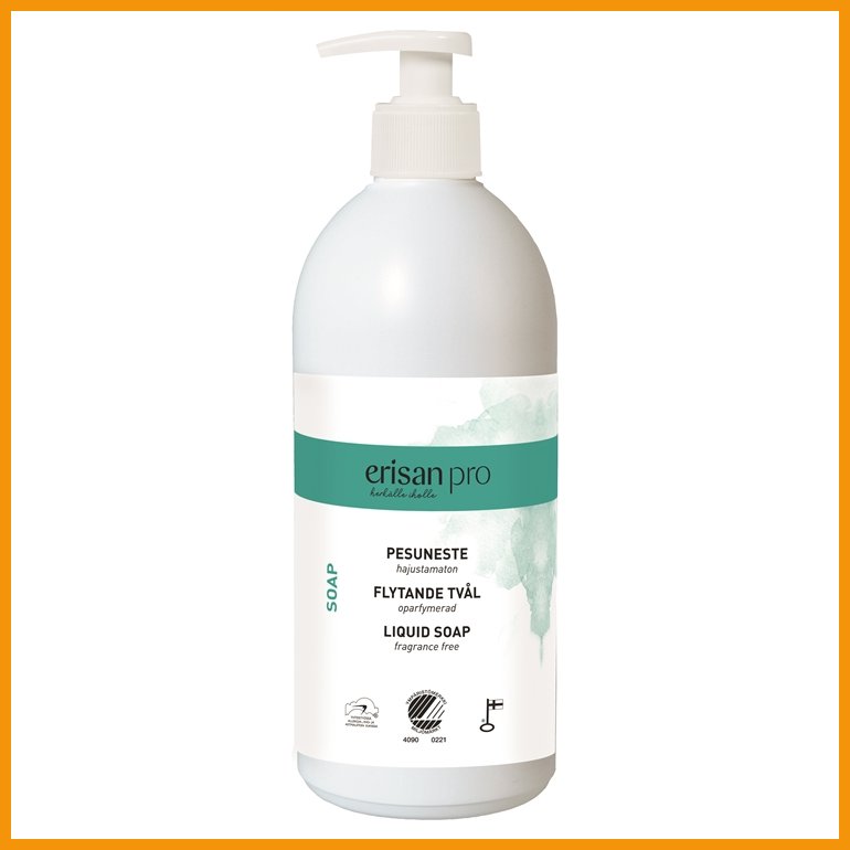 Erisan Pro Soap on tehokas ja hellävarainen nestesaippua ammattikäyttöön. Hajustamaton ja hoitava tuote on tehokas, mutta samalla hellävarainen. Riittoisa ja taloudellinen tuote vaahtoaa miellyttävästi ja huuhtoutuu helposti. Myös usein toistuvaan käsien pesuun soveltuva saippua sisältää ihoa kosteuttavaa glyserolia.Kotimaisella ja hellävaraisella tuotteella on sekä kotimainen Avainlippu, pohjoismainen Joutsenmerkki että Allergia-, Iho- ja Astmaliiton tunnus.