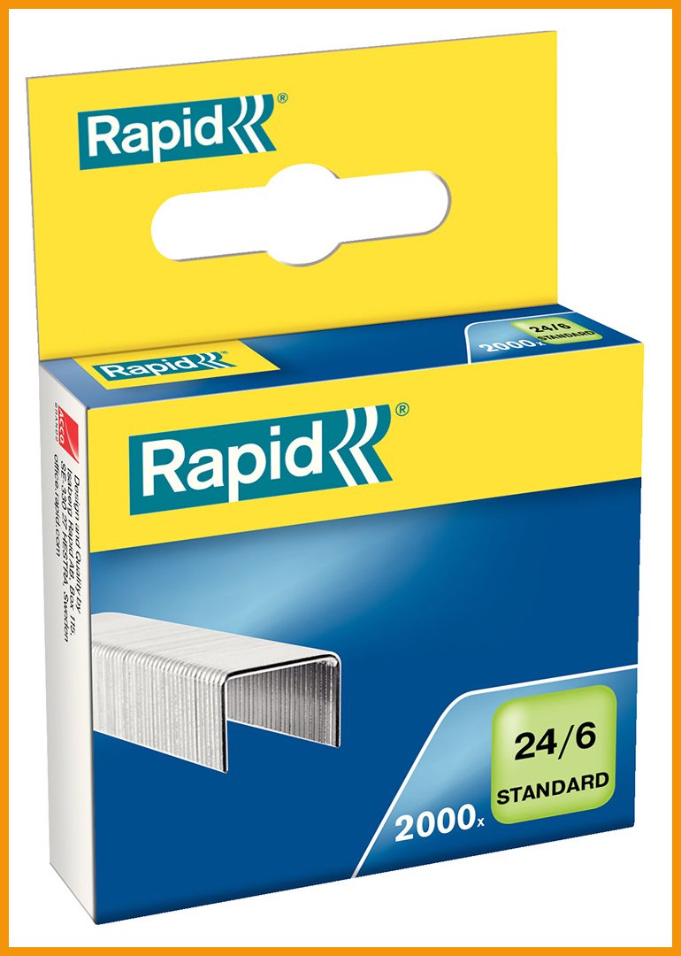 Rapid Standard 24/6 on galvanoidusta teräslangasta valmistettu niitti Rapid -nitojiin 10BX, 20EX, E12, E14, E15, E26, E28, F1, F16, F18, F30, FM20, FM22, FM32,K1, K2, K45, S1, S17, S27, S30 ja S50.Koko: 24/6