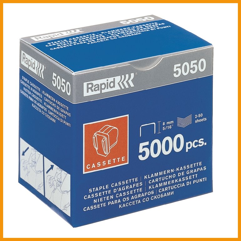 Rapid-niittikasetti sopii Rapid 5050e-sähkönitojaan. Kasetti on helppo ladata paikalleen.Niittejä kasetissa: 5000
