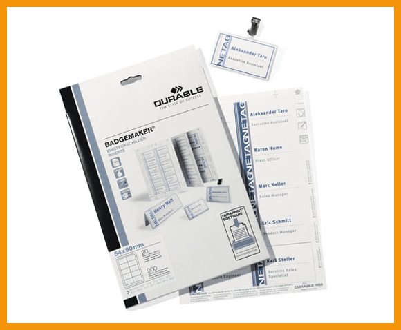 Durable Badgemaker on nimikorttien vaivattomaan tulostamiseen kehitetty nimikorttiarkki. Yhdellä A4-kokoisella arkilla on 12 valmiiksi mikroperforoitua käyntikorttia, jotka on helppo irrottaa toisistaan tulostuksen jälkeen. Arkit soveltuvat kopiointiin ja sekä mustesuihku- että lasertulostamiseen.Arkin koko: A4