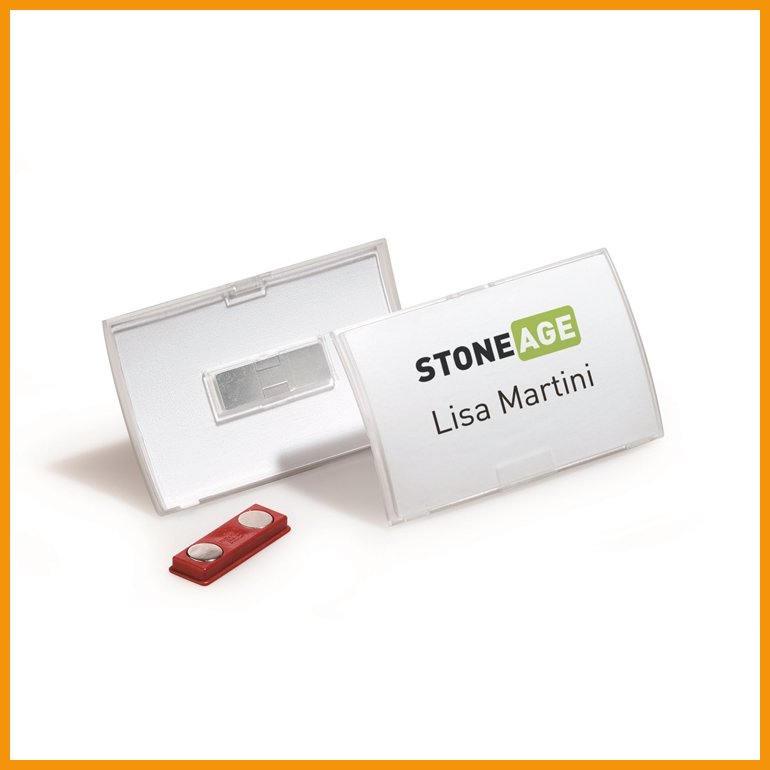 Durable 821519 on kaarevaksi muotoiltu nimikorttikotelo, jossa on vaatteita vahingoittamaton magneettikiinnitys. Nimikortti on helppo lisätä ja poistaa. Kotelo on valmistettu läpinäkyvästä, 70-prosenttisesti kierrätetystä PP-muovista.Mitat: 54 x 90 mm
