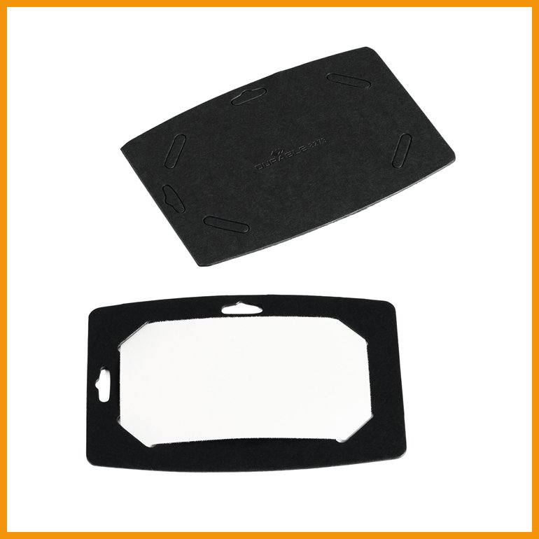 Durablen 100-prosenttisesti kierrätyspaperista valmistetut nimikyltit auttavat vähentämään konferenssien ja muiden tapahtumien ympäristörasitusta. Kun vaihtoehtona olisivat muoviset, vain kerran käyttöön pääsevät nimikyltit, on kierrätyspaperista valmistettu kertakäyttöinen vaihtoehto paikallaan. Voit käyttää kylttejä sekä pystysuorassa että vaakasuorassa yhdessä kaulanauhan tai klipsin kanssa.Tukevassa pahvilaatikossa toimitettava setti koostuu 20 mustasta nimikyltistä, jotka on valmistettu jäykästä 315 g/m2 kartongista. Neljällä A4-arkilla on kullakin viisi valmiiksi leikattua ja helposti irrotettavaa nimikylttiä. Mukana on myös kolme A4-kokoista Badgemaker-arkkia, joissa on yhteensä 36 valkoista etikettiä osallistujien nimiä varten.